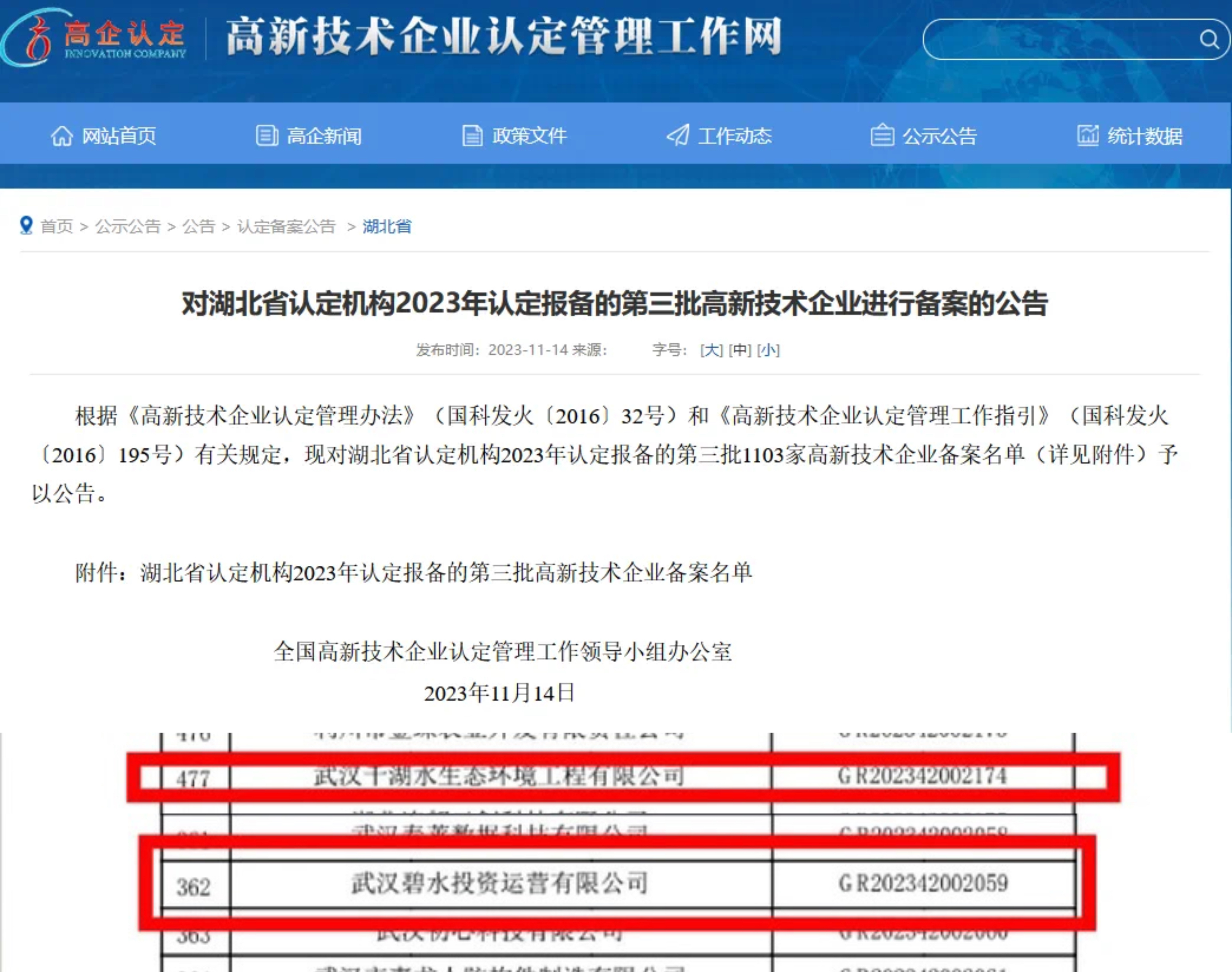 ? ? ? ?11月14日,全國高新技術企業認定管理工作領導小組辦公室下發了“對湖北省認定機構2023年認定報備的第三批高新技術企業進行備案的公告”,碧水集團所屬武漢千湖水生態環境工程有限公司、武漢碧水投資運營有限公司雙雙上榜,被認定為國家高新技術企業。